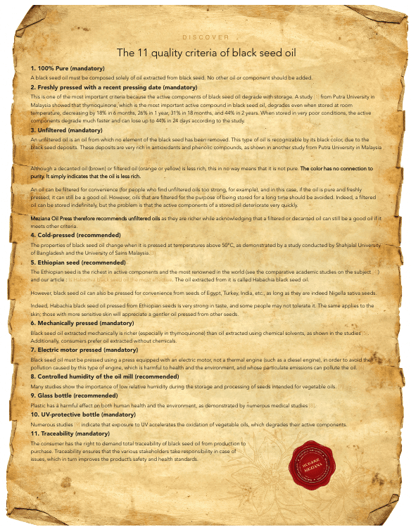 Despite its small size, it has disrupted the French-speaking black seed oil market by creating the Meziana Oil Press quality charter, which consists of 11 criteria ensuring an exceptional black seed oil crafted according to traditional methods and high production standards.